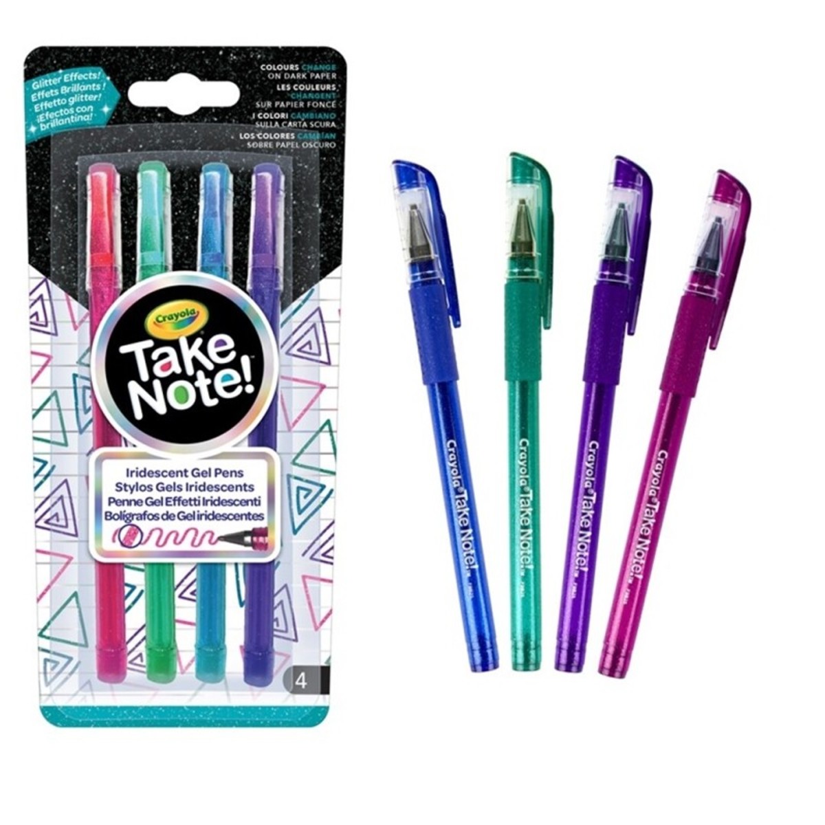 Take Note! 4 Bolígrafos de Gel Efectos IridiscentesBolígrafos con tinta gel lavable en 4 colores con matices iridiscentes para untoque chispeante.