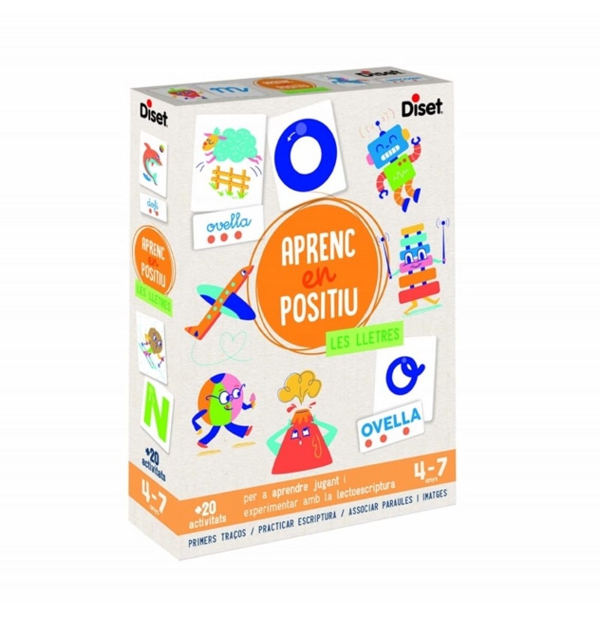 Aprenc en positiu les lletres ofereix als nens i nenes entre 4 i 7 anys tot un conjunt de material manipulatiu que els ajudarà a descobrir i experimentar la lectroescriptura al seu propi ritme. El material de la caixa permet: familiaritzar-se amb els sons de l'idioma, identificar i reconèixer les lletres de l'abecedari, practicar el traç amb el dit, relacionar imatges i paraules, començar a escriure en majúscules i minúscules, practicar l'escriptura associant la paraula amb la il·lustració, relacionar cda paraula amb el nº de síl·labes i jugar amb las paraules i les lletres.