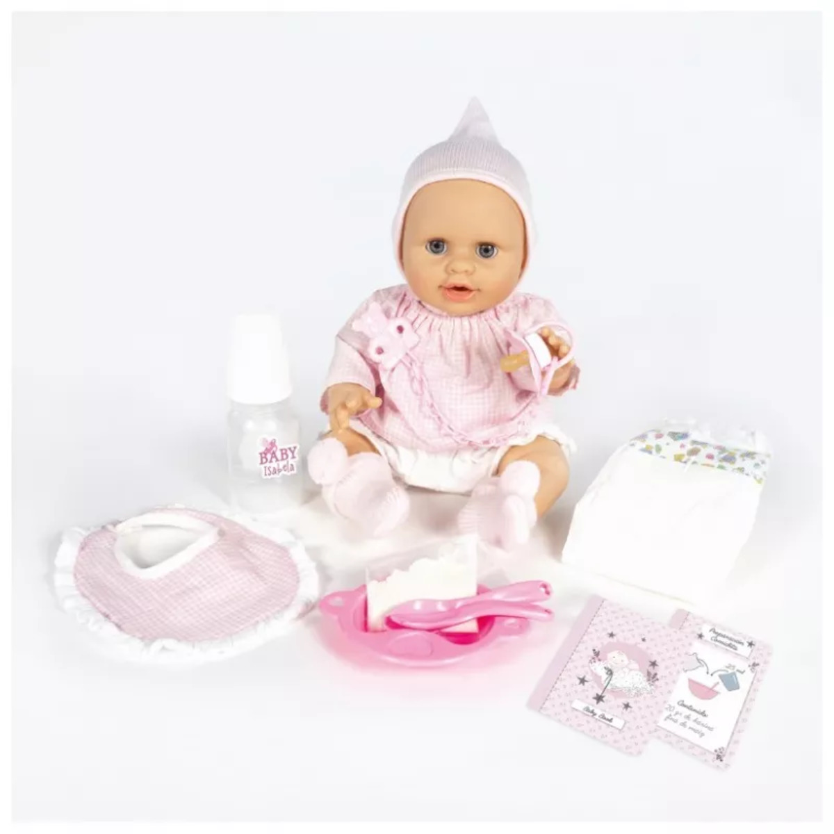 Juega con Baby Isabella de 38 cm, la nueva muñeca de La Nina by Berjuan. Baby Isabella es una muñeca articulada de vinilo interactiva sin mecanismo. No necesita pilas. Tiene todo el cuerpo de vinilo y articulaciones en cabeza, brazos y piernas. Le puedes poner y quitar el chupete como un bebé de verdad. También puedes darle el biberón y la papilla con su cucharita y platito. Si le levantas el brazo y lo aprietas después de comer o beber hace pipí y caca en su pañal. Incluye biberón, chupete, plato, cuchara, tenedor, pañal, papilla y certificado de nacimiento. Recomendada a partir de 3 años. Fabricadas en Onil – España.