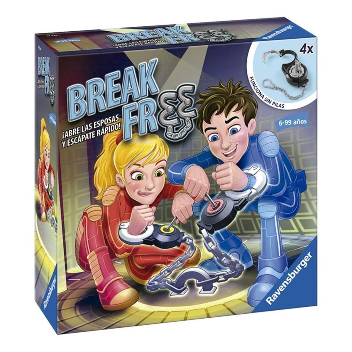 4 esposas con cadenas, 4 llaves, 4 tapas, 12 laberintos, 12 fichas, 1 reglamento de juego