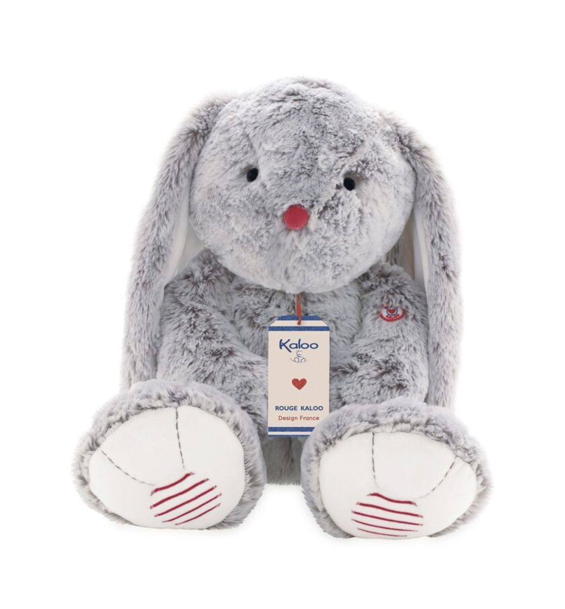 Conejo modelo Prestige de 55 cm con un pelaje sedoso de color gris, extremadamente moderno y refinado. Su gran estatura es garantía de unos cálidos abrazos. Se presenta acompañado de una etiqueta personalizable alrededor de su cuello donde podrá escribir palabras de cariño que colmarán su regalo de emoción y ternura.