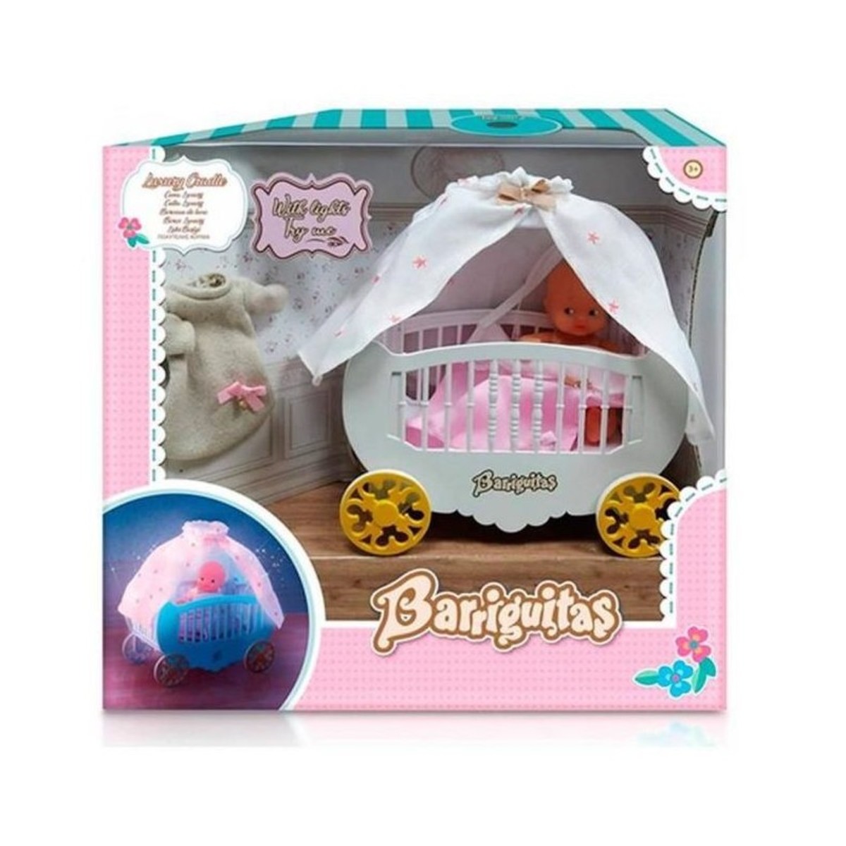 Barriguitas con su cuna con forma de carruaje real, con dosel de tela estampado en estrella, con luces reales, presiona el botón para encenderlas.