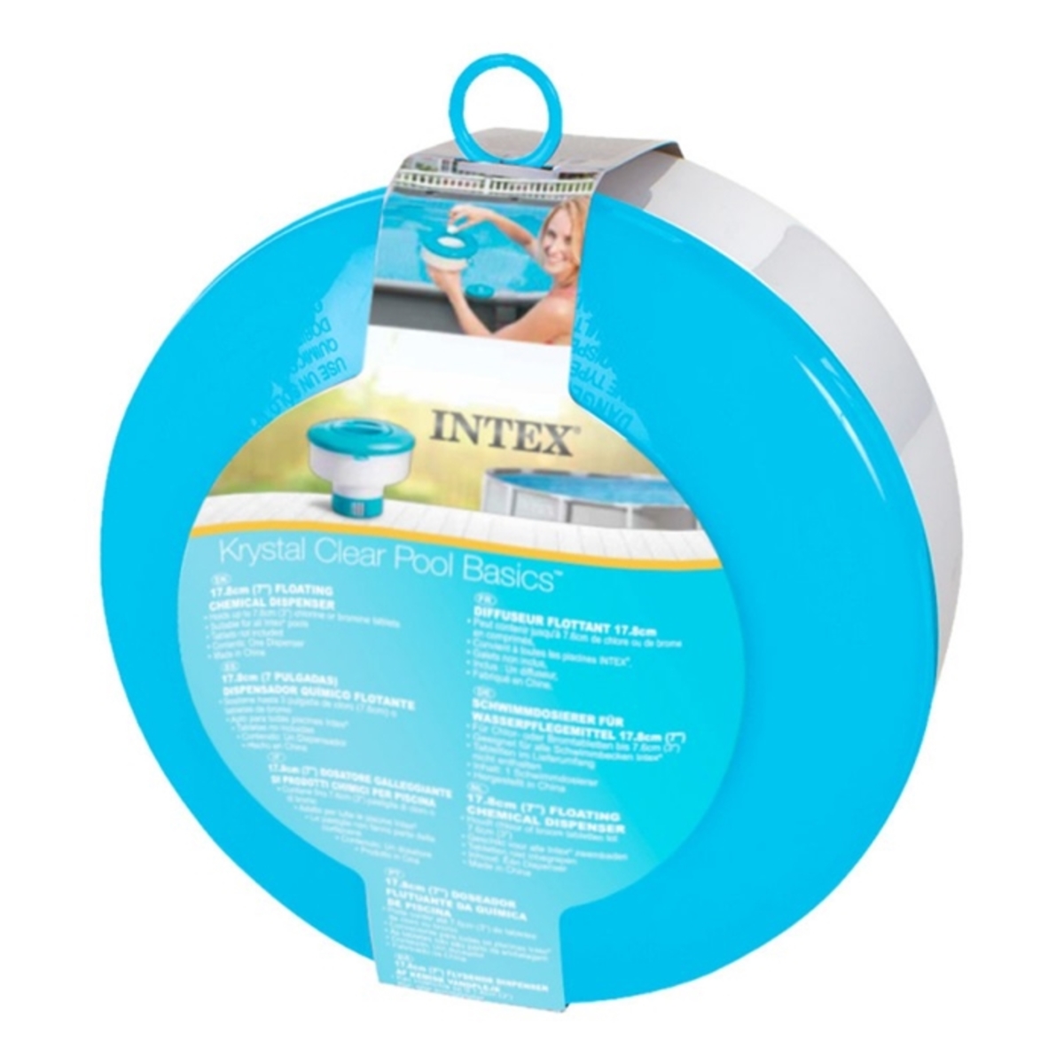 El dispensador químico INTEX para piscinas y spas con 17,8 cm de diámetro tiene capacidad para tabletas de cloro o bromo de Ø7,6 cm (no incluidas).