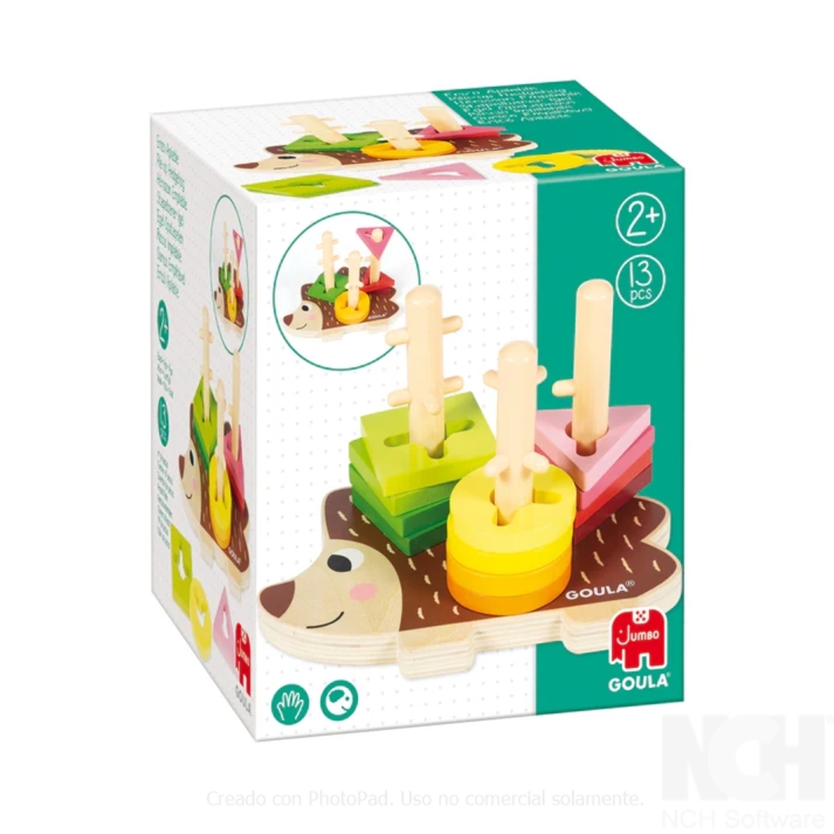 Erizo de madera del que salen unos palos para poder apilar distintas formas. El niño tendrá que clasificar las distintas formas en función del palo y en función del color que le corresponde. Tenemos un total de 12 piezas que apilar en el erizo con 3 formas distintas y 3 colores  escalonados.