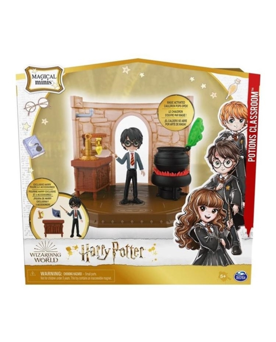 Bienvenido al mágico mundo de Wizarding World. La magia y la hechicería llegarán a tu casa con el fantástico Playset Aula de pociones. Incluye 1 figura de Harry exclusiva de 7cm. Ayuda a Harry a preparar una fantástica pócima de las incluidas en famoso libro de hechizos del príncipe mestizo. Coloca el soporte y el frasco de la poción Felix Felicis encima del pupitre y usa a Harry para abrir el caldero y prender las llamas. Puedes unirlo al Castillo de Hogwarts para incrementar la diversión. Incluye: 1 figura, 1 escenario y 3 accesorios