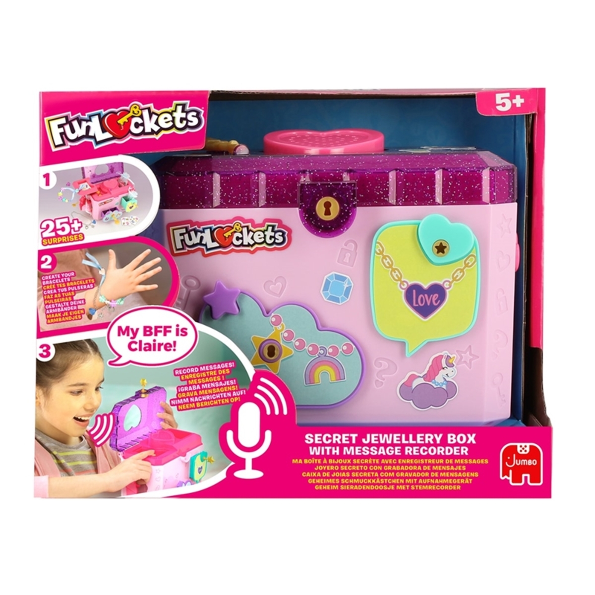 Encuentra las llaves y descubre las increíbles sorpresas, ¡incluida una grabadora de mensajes para mantener a salvo todos tus secretos! Personaliza con pegatinas, crea tus pulseras y encuentra los botones ocultos para grabar mensajes secretos.