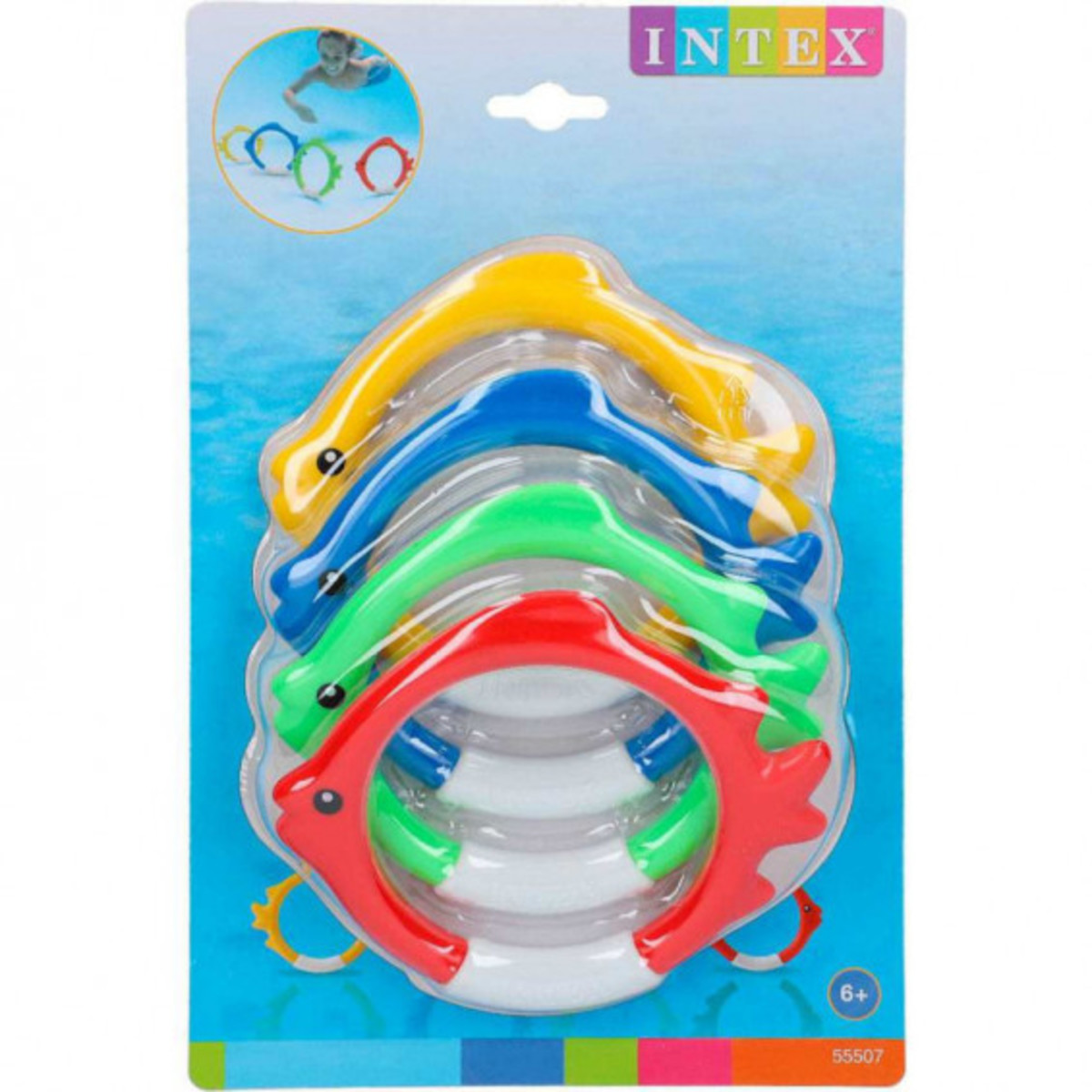 Buceo y diversión con este juego acuático con 4 aros sumergibles de INTEX. ¡Qué juego tan divertido! Lanzas las anillas al fondo de la piscina y hay que bucear para alcanzarlas.