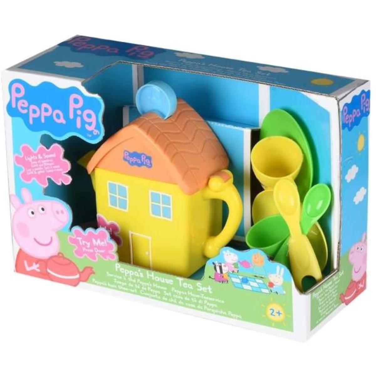 Juego de té con tetera en forma de casa de Peppa Pig. Incluye tetera, 2 tazas de té, 2 platos y 2 cucharas. Funciona con pilas (incluidas). Edad recomendada +2 años.