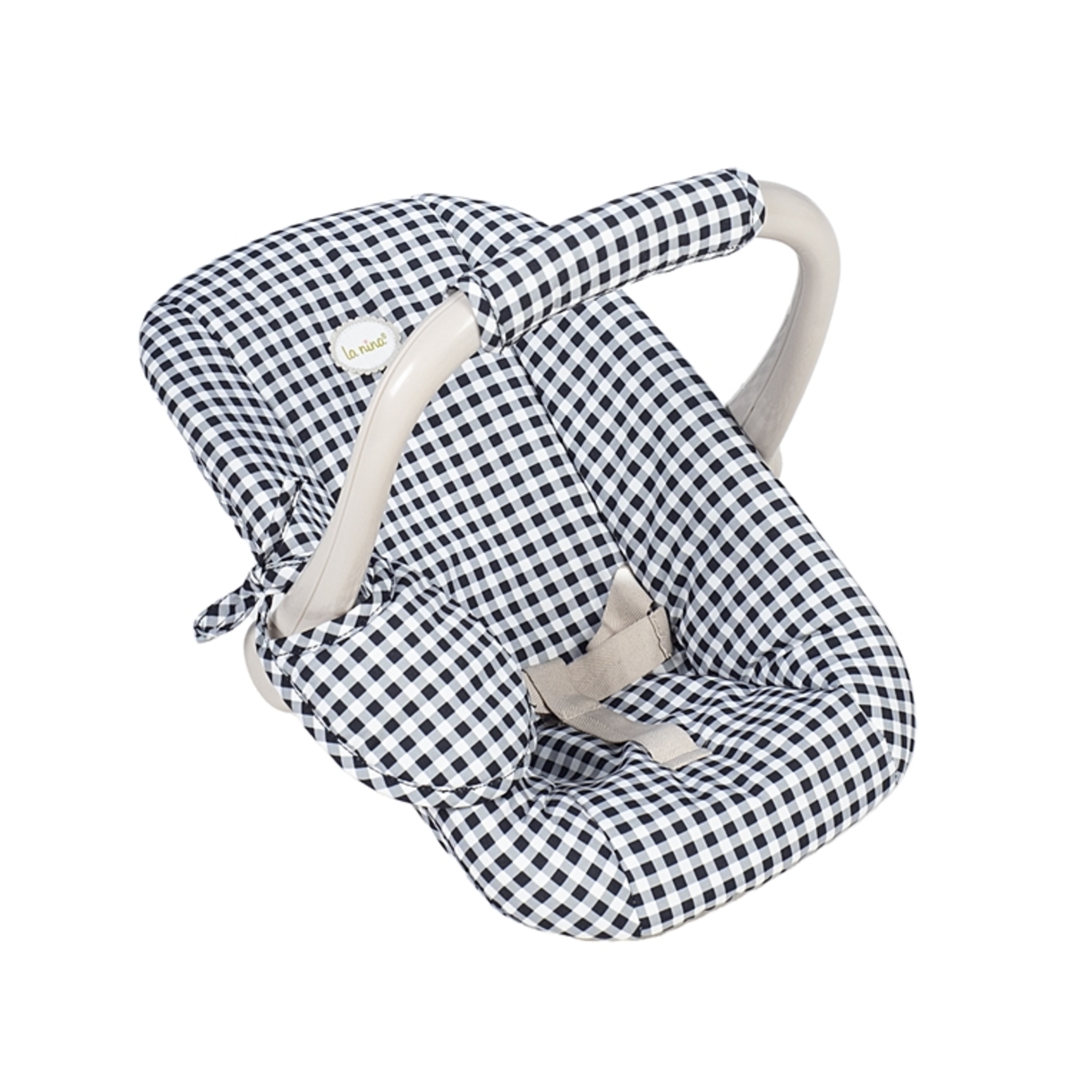 Portabebés con estampado vichy. El asa se reclina en diferentes posiciones e incluye babero a conjunto. El muñeco que puede ponerse en el capazo puede medir entre 30 y 52 cm. Puede lavarse a máquina.
