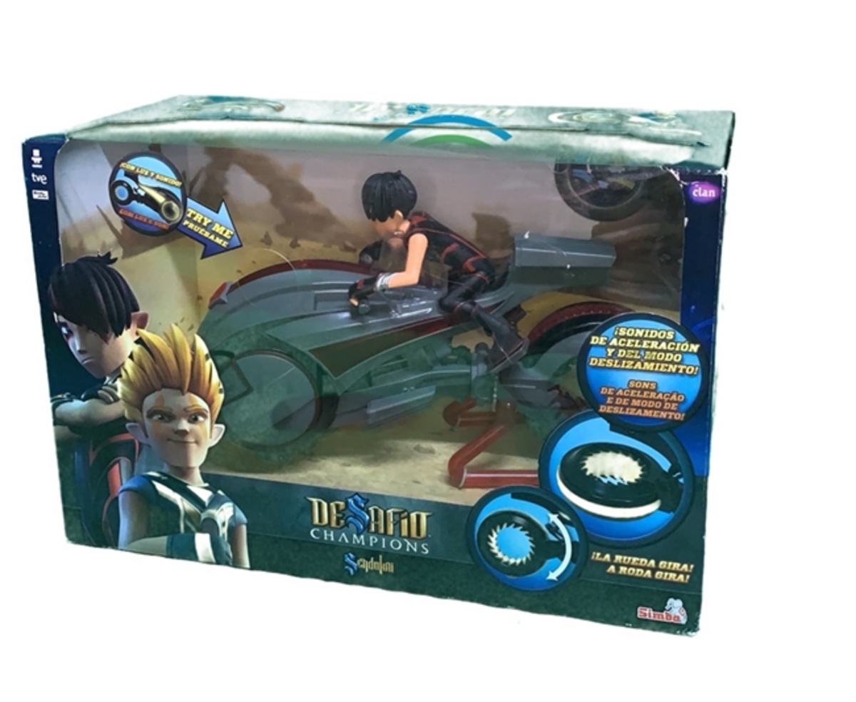 Moto de 25cm con luz y sonido que incluye una figura de 12cm de la serie Desafio Champions Sendokai. ¡Sonidos de aceleración y del modo deslizamiento! ¡La rueda trasera gira y la moto se transforma!