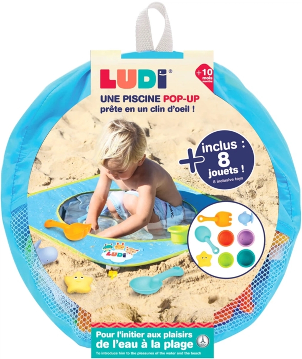 Piscina plegable playa Gracias a la piscina de playa deplegable, los niños pequeños pueden disfrutar del agua del mar . ¡Viene con 9 juguetes de playa y 1 bolsa de transporte! Ligera y poco voluminosa, se coloca en su bolsa. Edad: A partir de 10 meses