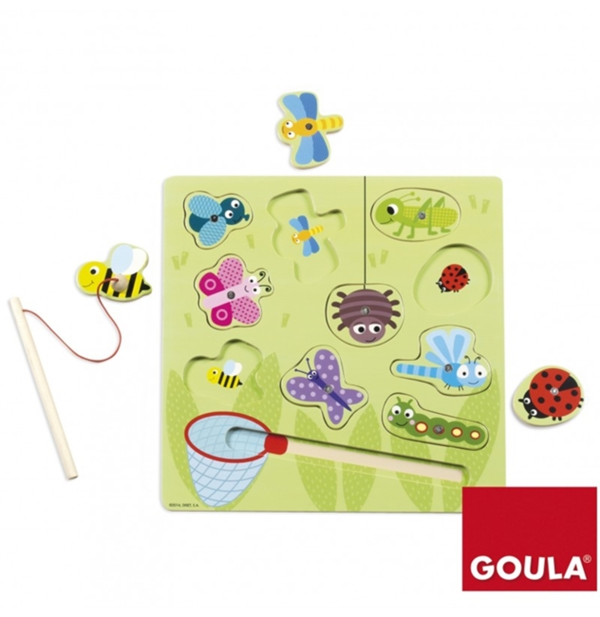 ¡Caza los diferentes bichos con este cazamariposas de madera magnético! Vuelve a colocar la pieza en el puzle guiándote por la forma y dibujo de la base. Desarrolla la habilidad manual y la coordinación ojo /mano.