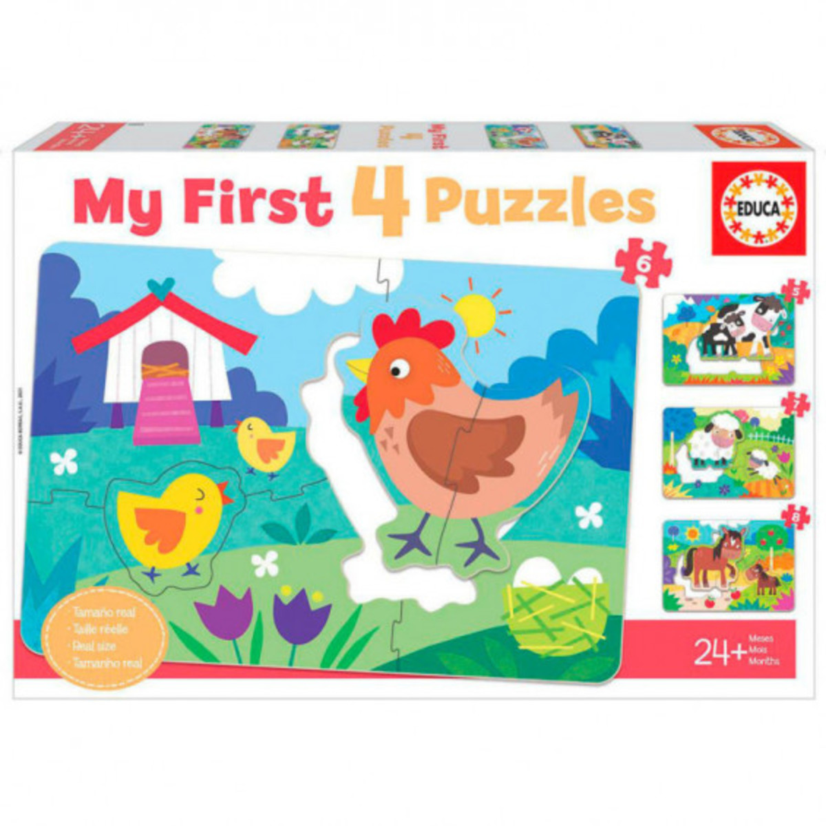 Puzzles progresivos de 5 a 8 piezas. Cada puzzle incluye figuras extraíbles de 1, 2 o 3 piezas. Atractivas y coloridas escenas, ideales para edades a partir de 24 meses. Piezas grandes, fáciles de manipular y de encajar. Temática: mamás y bebés de la granja.