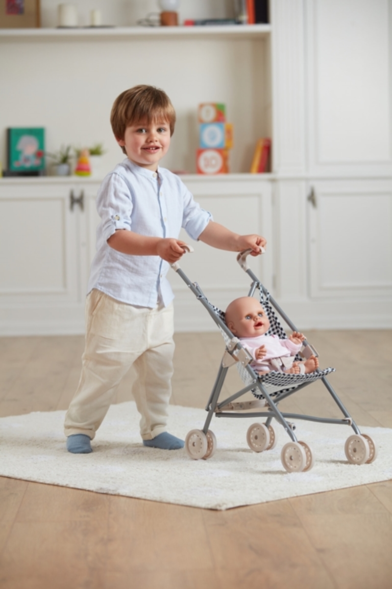Silla pequeña de paseo plegable en forma de tijera con estampado vichy. Tiene una estructura metalizada muy resistente que puede plegarse completamente. El muñeco que puede ir en la sillita puede medir entre 30 y 42 cm. La tela del cochecito se retira fácilmente para poder lavar a máquina.