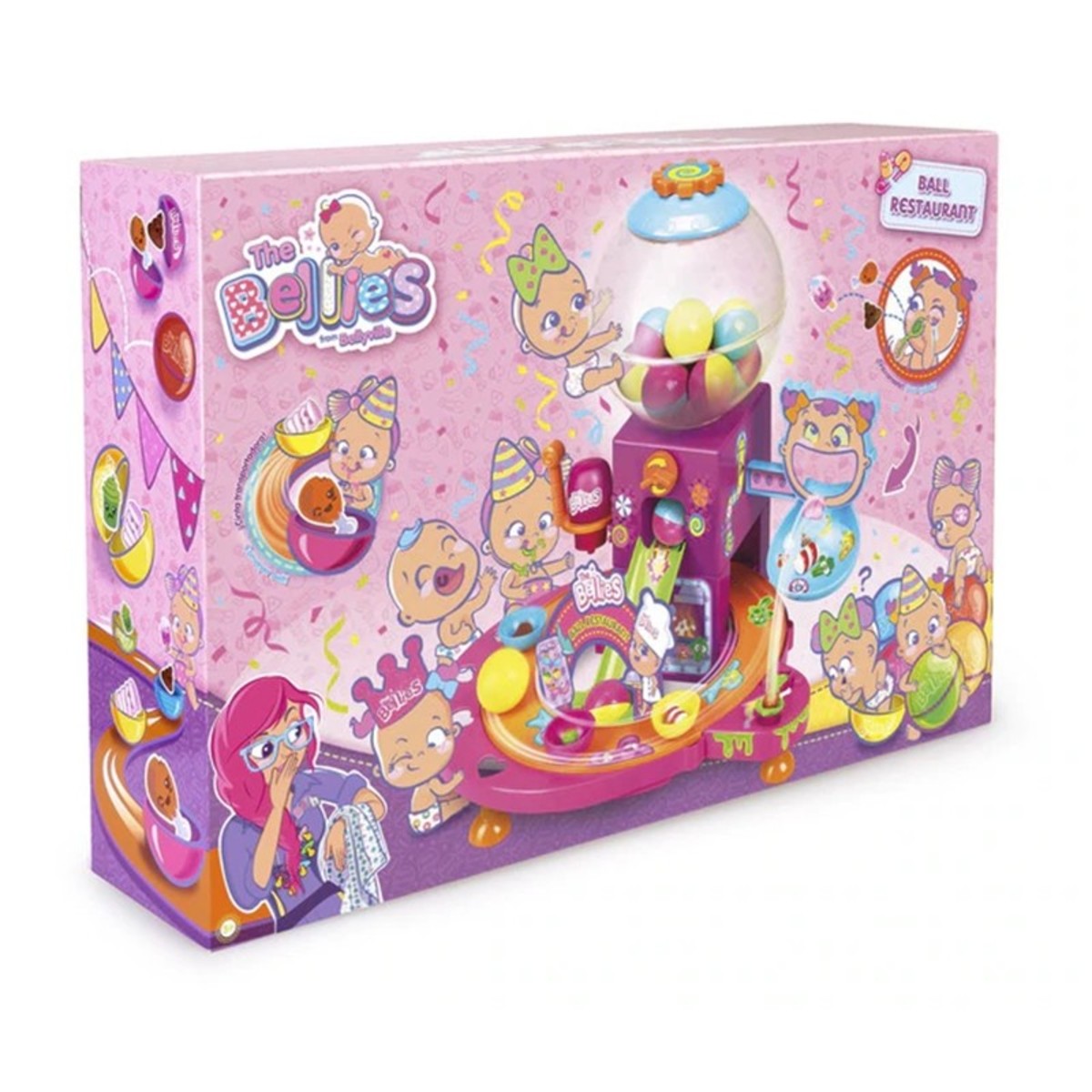 ¿Cómo funciona? Gira la rueda y deja que una bolita con comida caiga por el tobogán, los niños tendrán que abrirla y descubrir qué comida van a comer los Bellies y ponerla en la cinta transportadora de comida.