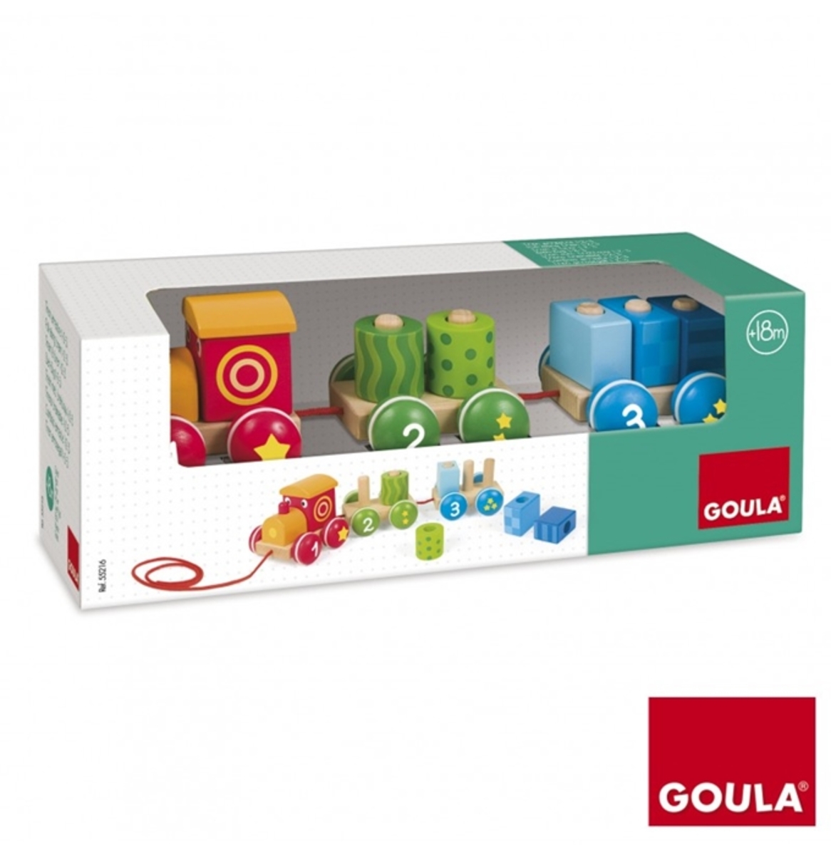 Tren arrastre de madera de tres vagones. Piezas extraíbles de formas geométricas. Progresivo piezas 1,2,3. Aprendizaje de los colores básicos y de los números del 1 al 3